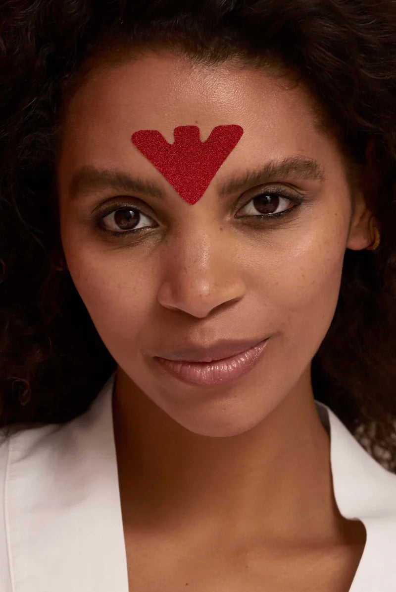 A playful yet functional taping system designed to relax the glabellar area and soften expression lines, adding a touch of glamour. These self-adhesive, jewel-like patches gently reduce tension between the brows, helping prevent habitual twitching and expressive lines. Carefully developed as a clean, non-invasive alternative to injectables, they work by promoting awareness and release of muscle contractions, maintaining a natural, soft and open expression. Ideal for everyday use or for special moments where beauty and fun meet.